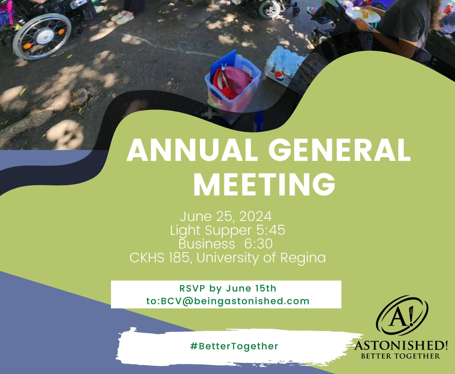 CKHS 185, University of Regina Regina, Saskatchewan, CanadaThe Astonished! AGM will take place June 25, 2024 at 6:30 pm at The University of Regina. Light Supper: 5:45 pm Business: 6:30 pm RSVP by June 15th to: BCV@beingastonished.com #BetterTogether